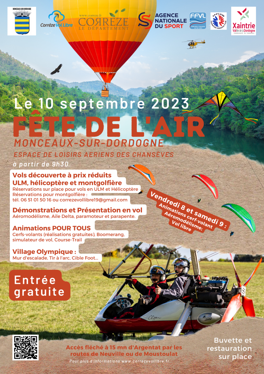 La Fête de l’Air, c’est un événement festif et convivial qui a lieu tous les ans et qui permet à l’association Corrèze Vol Libre de faire découvrir au grand public l’ensemble de ses activités : ULM, aile delta, parapente, cerf volant, modélisme.